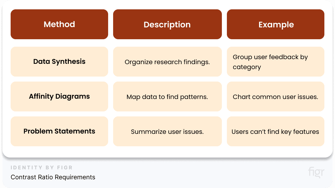 - Organize Information: Analyze the data collected to identify common themes and key issues. Use tools like affinity diagrams to group and prioritize findings.