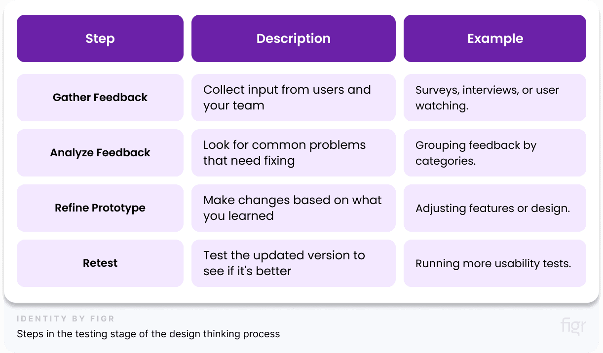 Here are the steps involved in the Testing stage of the Design Thinking Process: