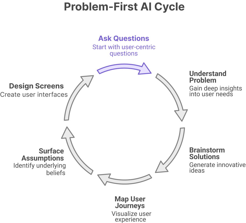 The alternative is problem-first thinking. Before you generate any screens, you generate understanding.