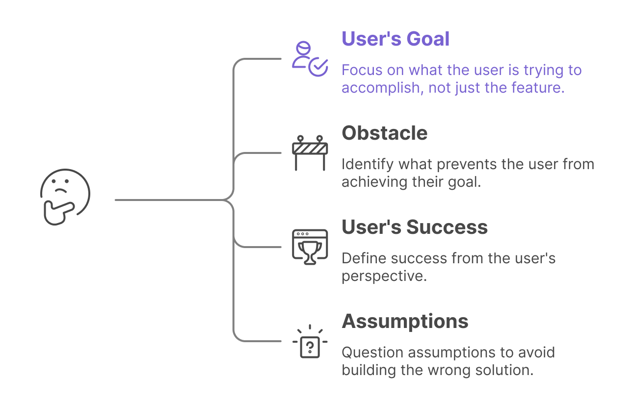 Take your next feature idea and write down the four questions. What is the user trying to accomplish? What's preventing them? What would success look like? What assumptions might be wrong?